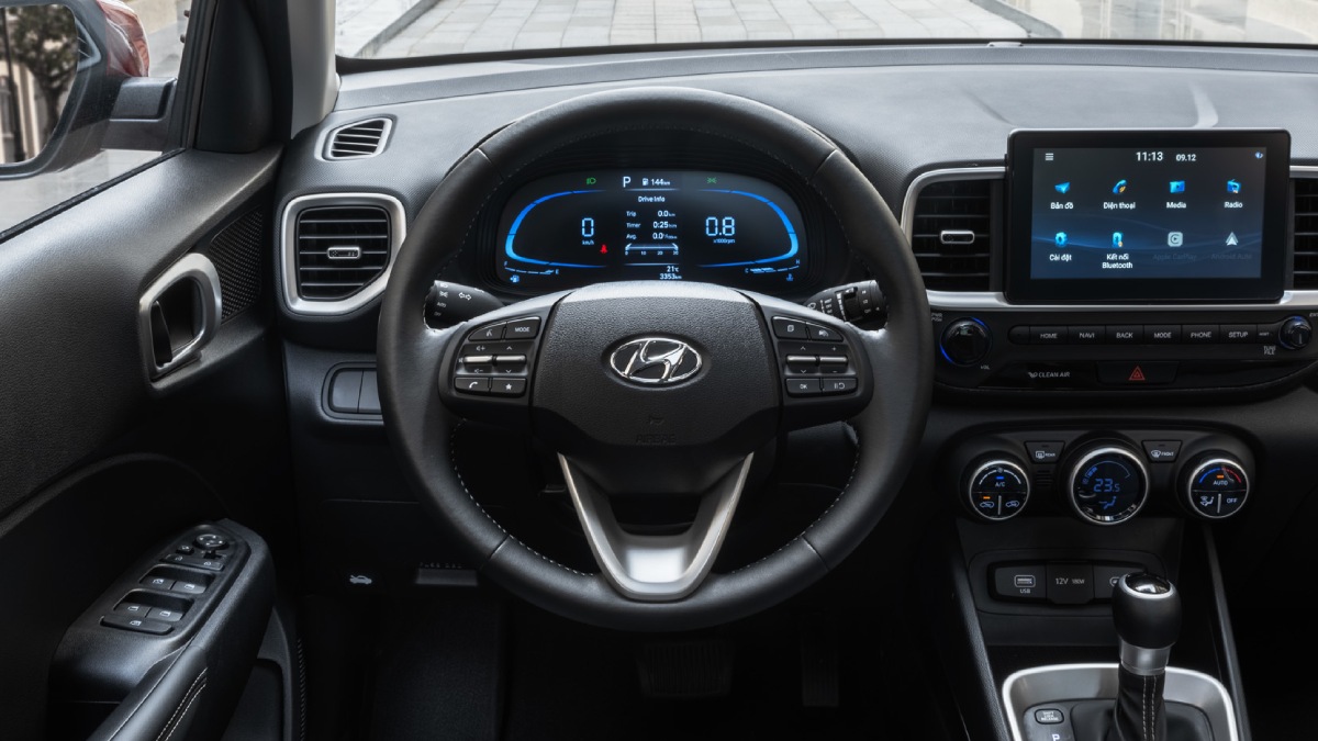 Nổi bật ngay trung tâm taplo là màn hình cảm ứng 8 inch hiển thị sắc nét. Hyundai Venue 2025 sử dụng vô lăng 3 chấu bọc da, bên trên tích hợp các nút bấm tiện lợi. Ngay sau đó là cụm đồng hồ kỹ thuật số hiện đại cho phép thay đổi giao diện theo chế độ lái, giúp người điều khiển hạn chế phân tâm và quan sát dễ dàng hơn.